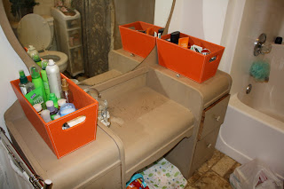 I stole some baskets from my craft room, threw some things away, and then made a “his” basket and a “her” basket. I also went through a small pantry type closet in our bathroom and threw out a ton of old prescription pills, almost empty hair styling products, old vitamins, etc.