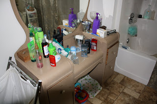 This is the dreaded bathroom. As you can see, we have multiples of almost everything. Don’t ask me why my husband has five deodorants.
